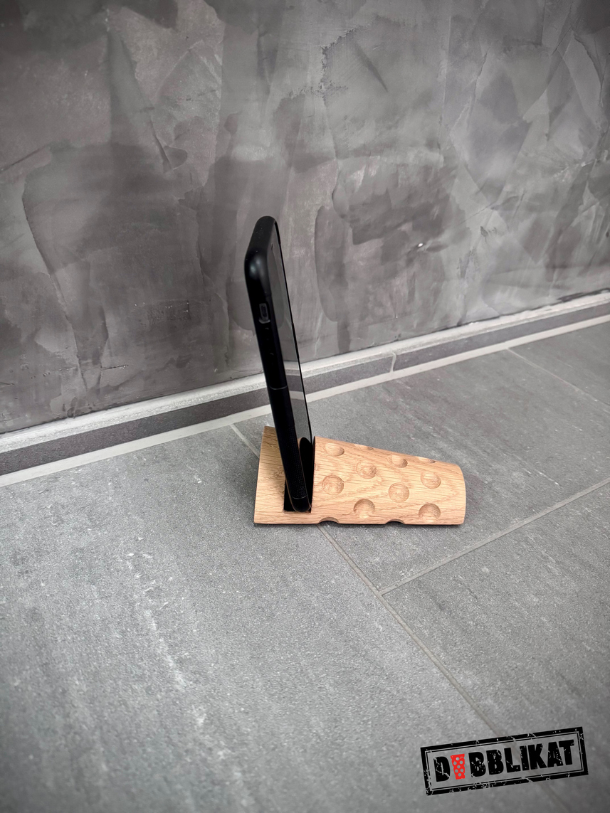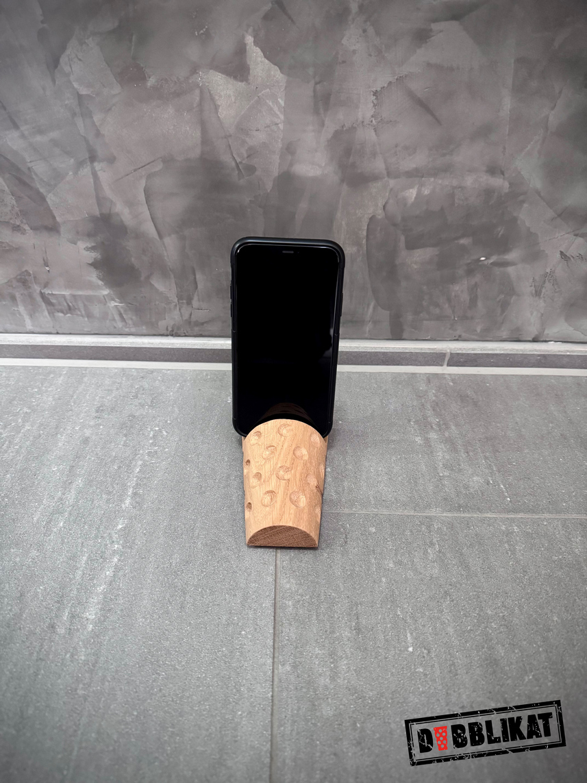 Der Dubblikat Handyhalter wird aus kammergetrocknetem Eichenholz gefertigt. Ähnlich wie bei einem Weinfass aus Holz, besteht auch er aus einzelnen Elementen, die jedoch wasserfest verleimt sind. Der Halter orientiert sich an der Größe des 0,25 l Dubbenglases und hat am dicken Ende einen ca. 1,5 cm breiten Einschnitt. In dieser Kerbe ist ein Filzstreifen eingeklebt, auf dem ein Smartphone bequem Platz findet.