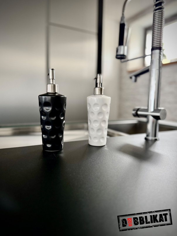 Der Griffelbuzzer von Dubblikat ist aus Keramik und hat einen Pumpkopf aus Edelstahl. Er hat ein Fassungsvermögen von rd. 250 ml und wird mit flüssiger Handwaschseife (nicht im Lieferumfang enthalten) befüllt.
