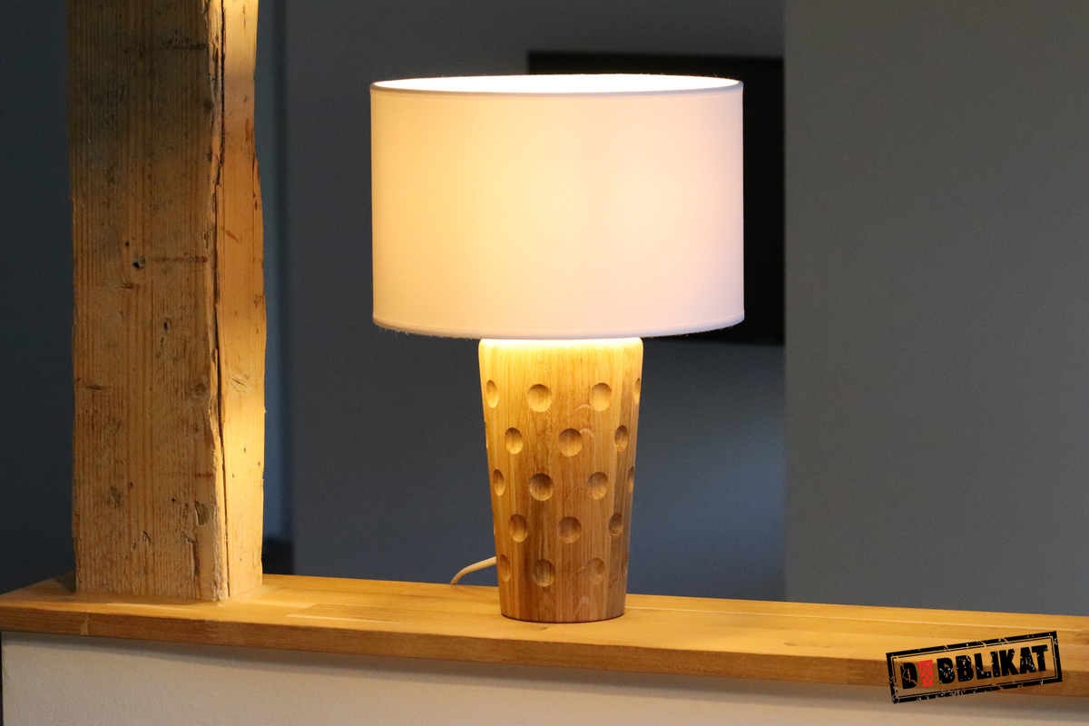 Der Lichtapparat von DUBBLIKAT besteht aus einem Hölzernen Korpus (19 cm hoch aus Eichenholz) und einem weißen Lampenschirm. Verbaut ist eine E27 Lampenfassung für Lampen mit einer Leistung bis 40 Watt. Es kann daher nach belieben die passende Lampe mit der gewünschten Lichtfarbe und -stärke selbst gewählt werden.